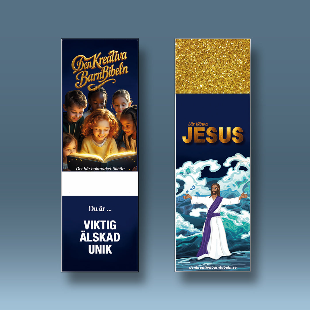 Ett bokmärke med glitterdetalj och ruta för barnet att skriva sitt namn i. Extra bra om flera barn delar på samma bok!