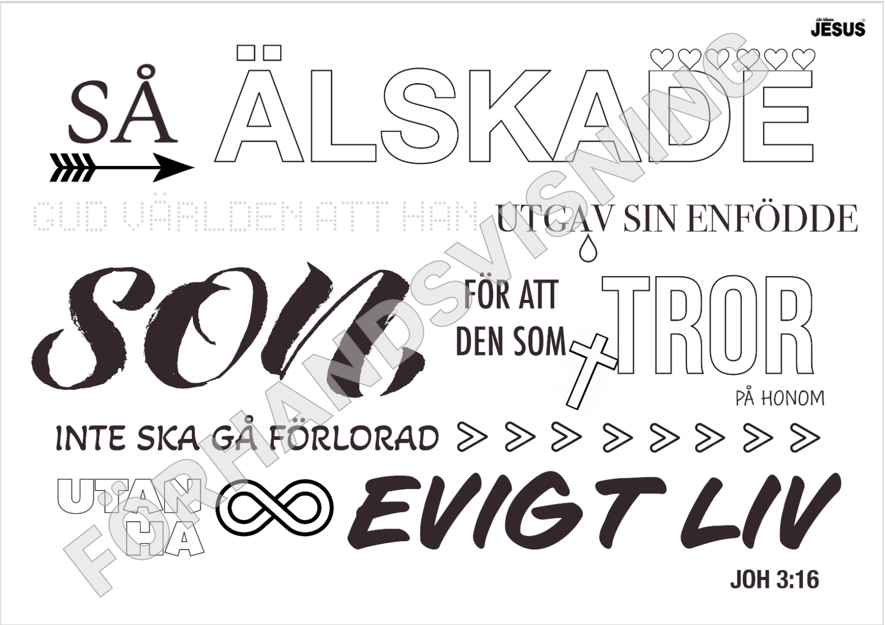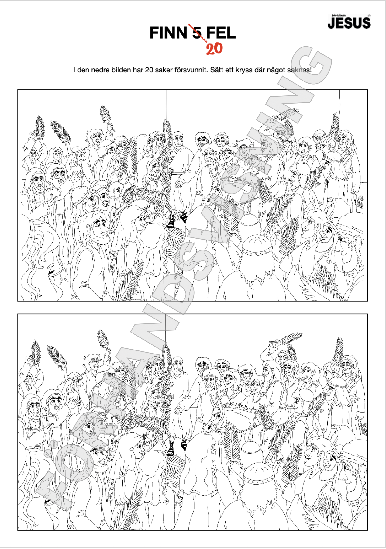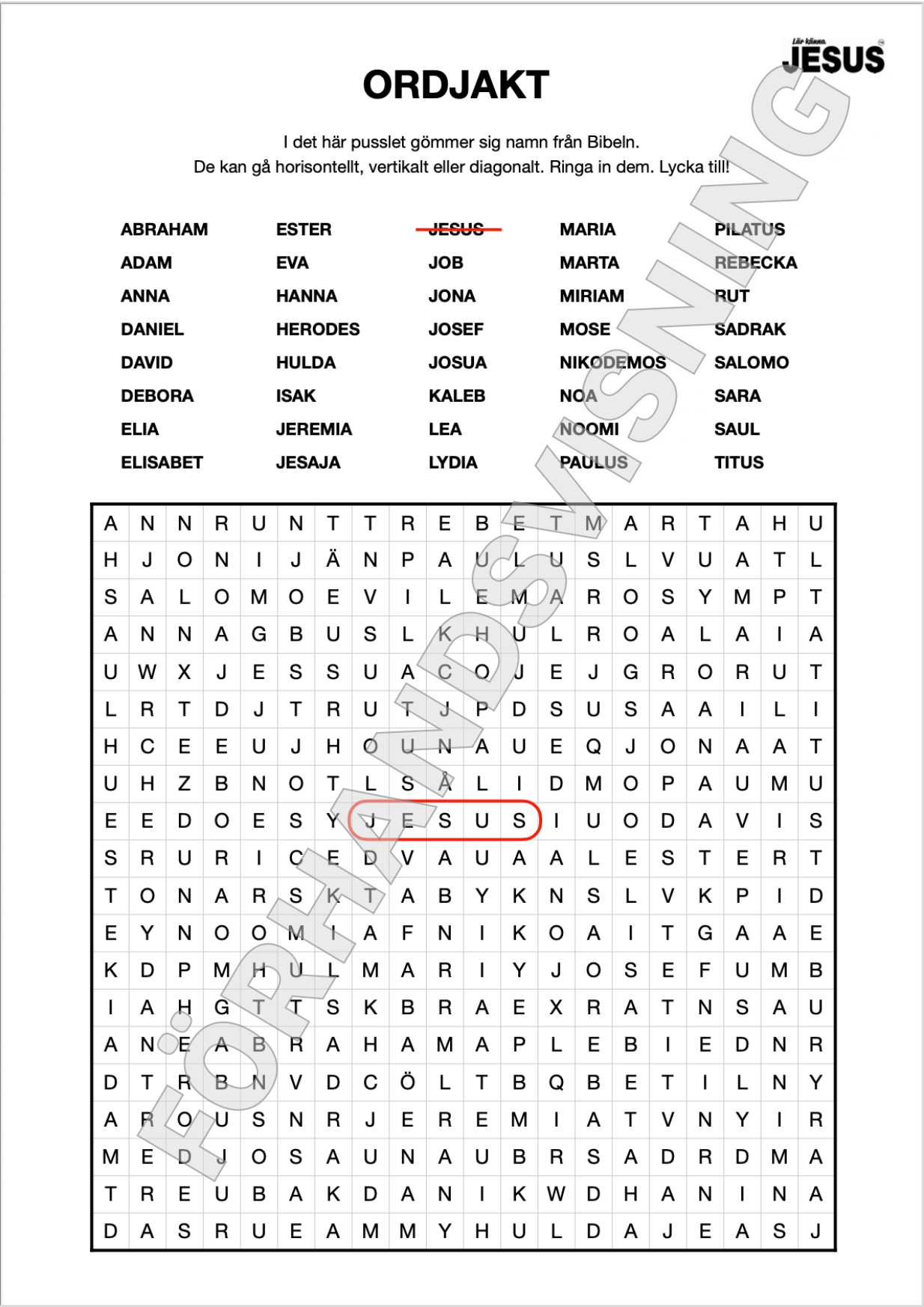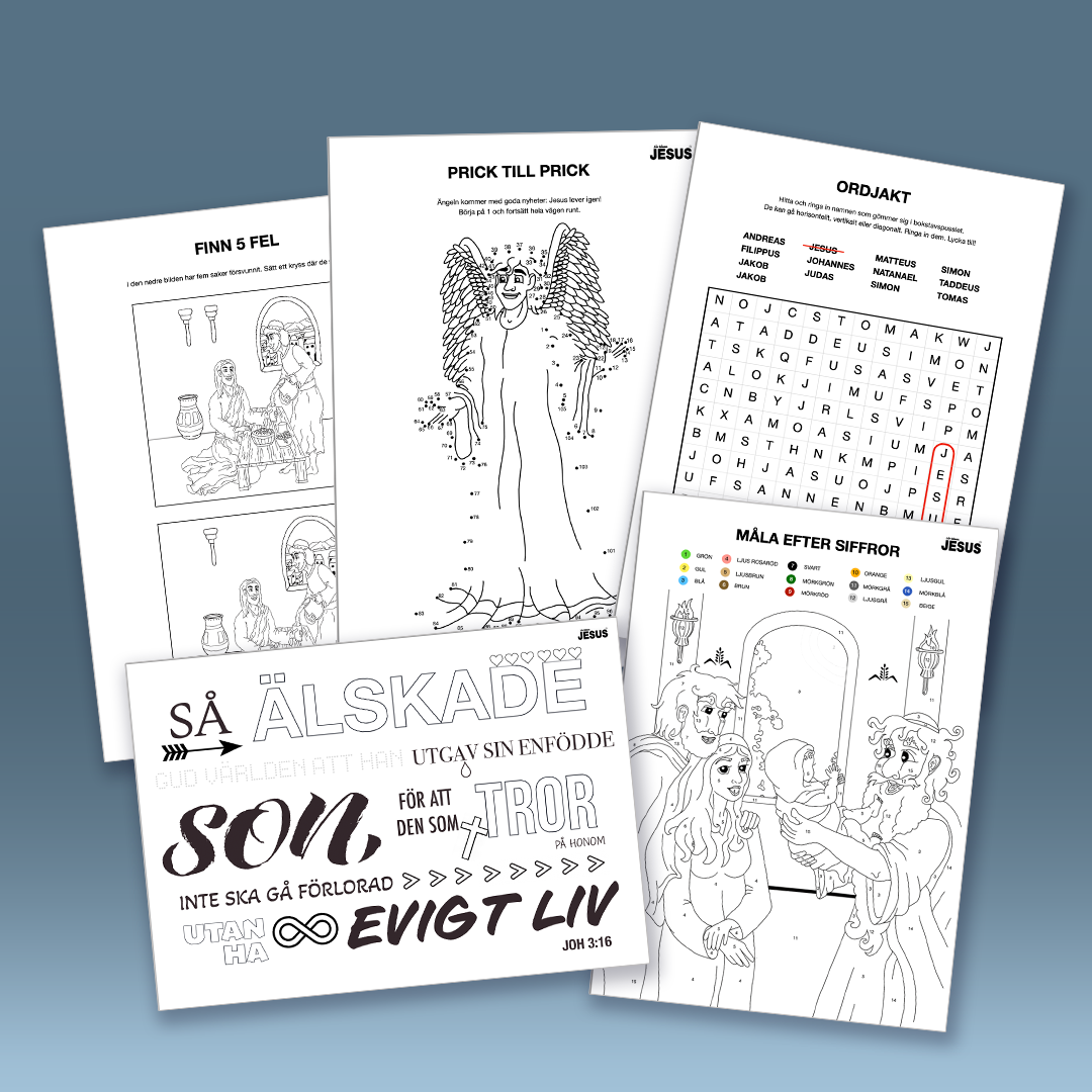 Digital produkt. 160 sidor med 133 olika pyssel/aktivitetsblad på temat "Lär känna Jesus". A4. Obegränsad användning i 2 år inom den egna, lokala verksamheten. PDF.