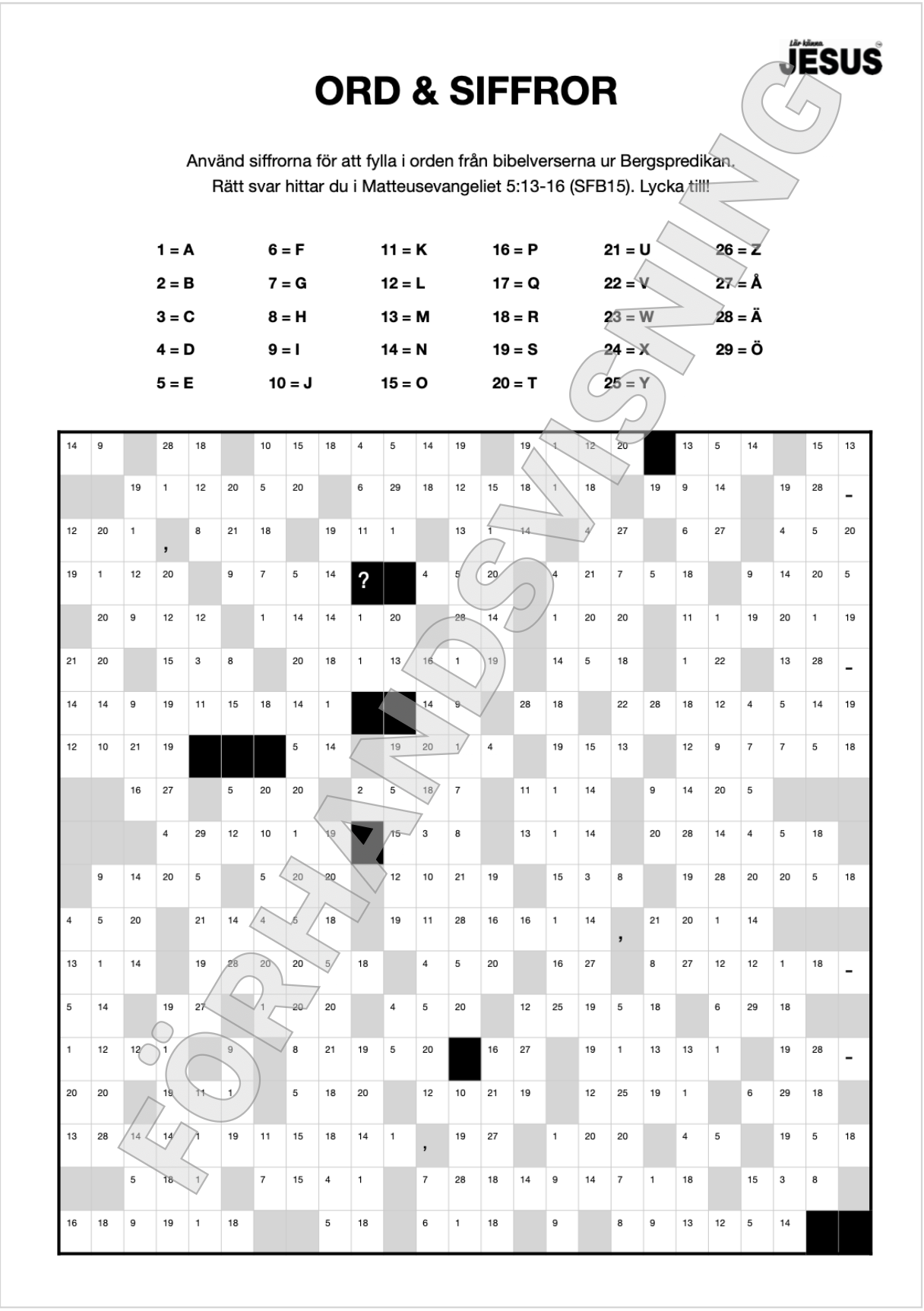 Material är avsett för den egna lokala verksamheten eller privat bruk. Det är inte tillåtet att dela, kopiera, eller sprida materialet till andra individer, verksamheter eller partners. Det är tillåtet att reproducera delar av materialet som en del av den egna verksamheten, till exempel för att skicka med barnen en sida hem. Det är förbjudet att skapa egna kompendium eller häften med materialet för utdelning eller försäljning, även inom den egna verksamheten.